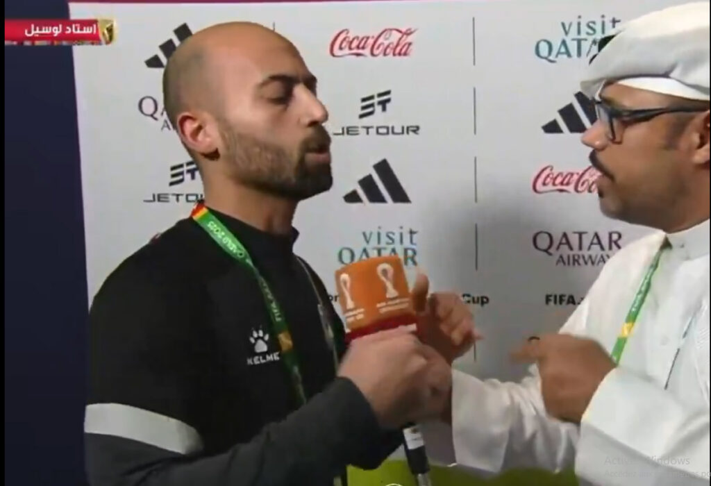 ومع انتظار المراسلين في المنطقة الإعلامية للحصول على تصريحات اللاعبين، فاجأ طارق زياد محلل أداء منتخب فلسطين، الجميع باقتحام البث المباشر لقناة “الكأس” القطرية، مطالبا بالحديث دون الكشف عن هويته قائلا:”أريد أن أقول كلمتين.. بدون تعريف أو أي شيء”.
