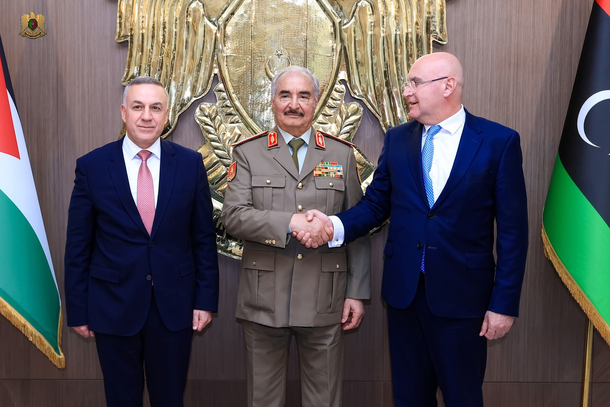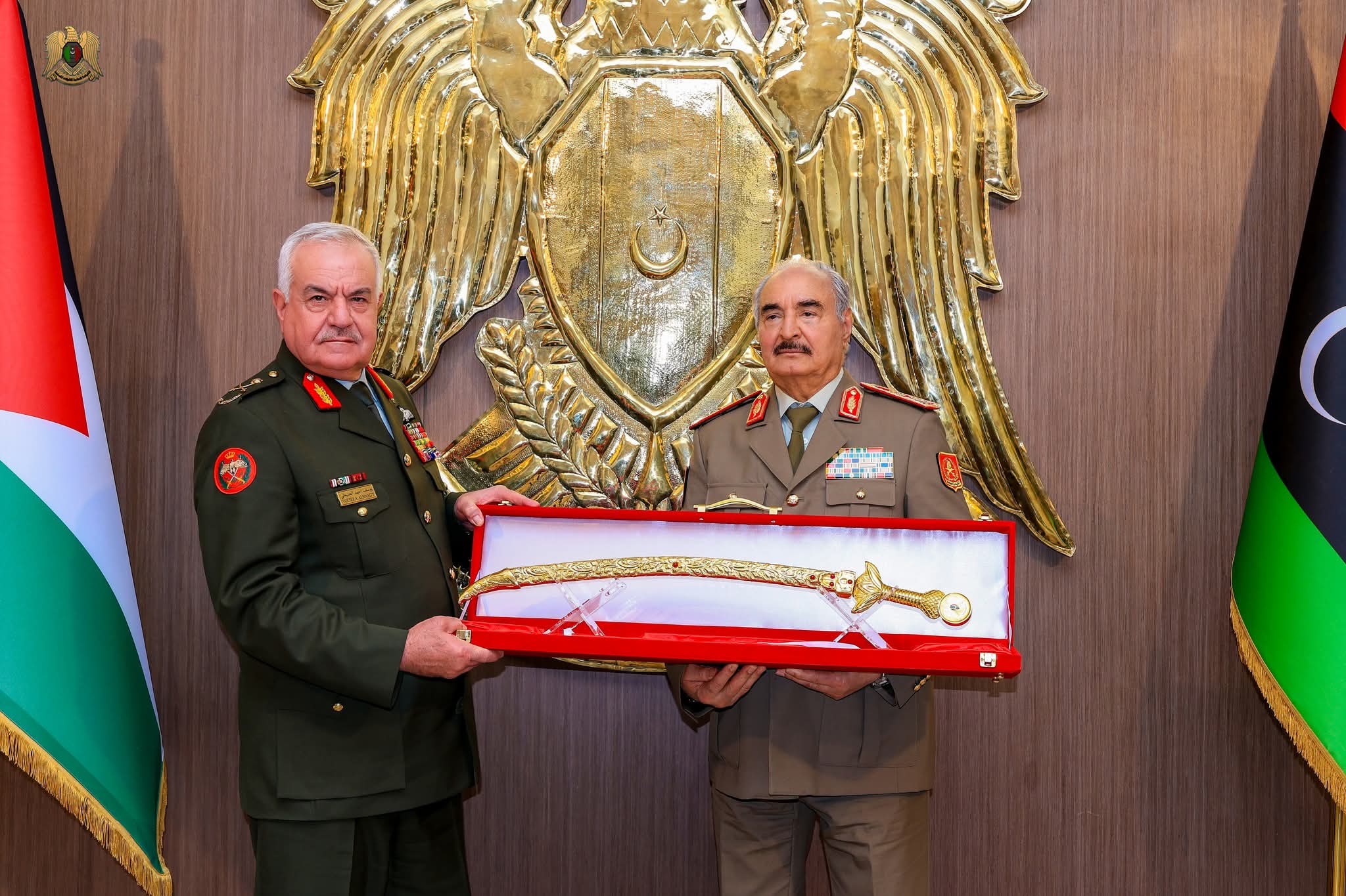 ليبيا – استقبل القائد العام للقوات المسلحة المشير خليفة حفتر ونائبه الفريق الركن صدام حفتر، بمقر القيادة العامة، وفداً رفيع المستوى من المملكة الأردنية الهاشمية برئاسة رئيس هيئة الأركان المشتركة للقوات المسلحة الأردنية اللواء الركن يوسف الحنيطي، وذلك في إطار التنسيق والتعاون المشترك بين القيادة العامة للقوات المسلحة الليبية والمملكة الأردنية الهاشمية.