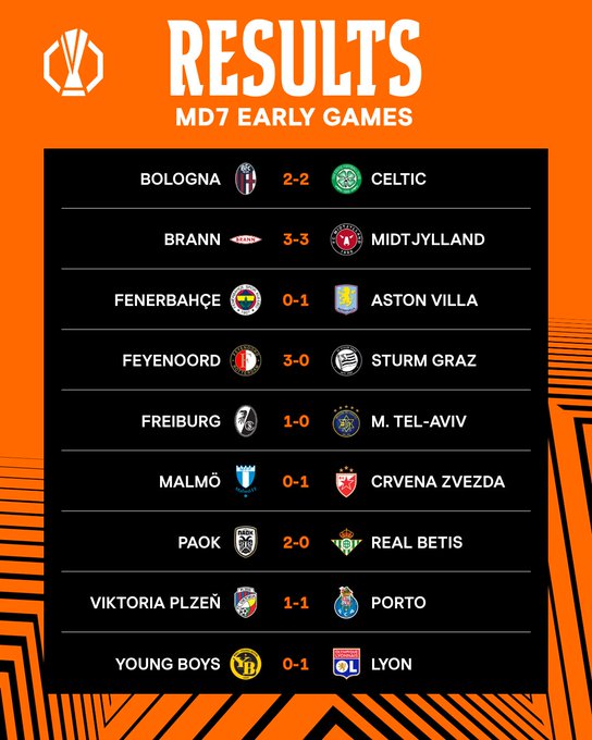 وتغلب ليون وأستون فيلا بالنتيجة ذاتها 1-0 على مضيفيهما يونغ بويز السويسري وفنربخشة التركي على الترتيب، يوم الخميس، في الجولة السابعة قبل الأخيرة للمسابقة القارية.