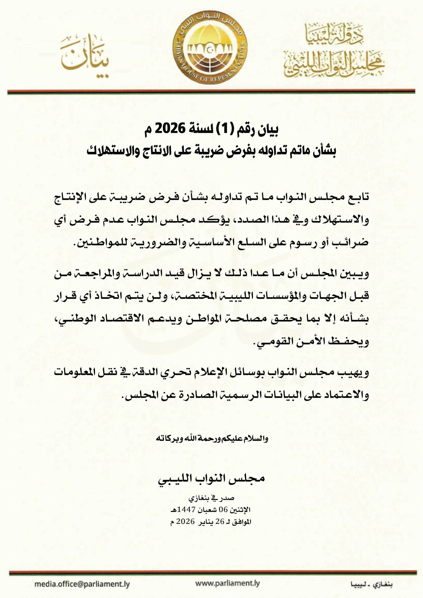 ليبيا – أصدر مجلس النواب بيانًا بشأن ما تم تداوله حول فرض ضريبة على الإنتاج والاستهلاك، مؤكدًا عدم فرض أي ضرائب أو رسوم على السلع الأساسية والضرورية للمواطنين.