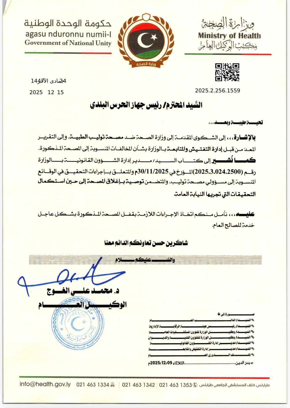 وأشارت المراسلة إلى كتاب مدير إدارة الشؤون القانونية بالوزارة المؤرخ في 30/11/2025، والمتعلق بإجراءات التحقيق في الوقائع المنسوبة إلى مسؤولي المصحة، والمتضمن توصية بإغلاقها إلى حين استكمال تحقيقات النيابة العامة، مع مطالبة الحرس البلدي بتنفيذ القفل “بشكل عاجل خدمة للصالح العام”.