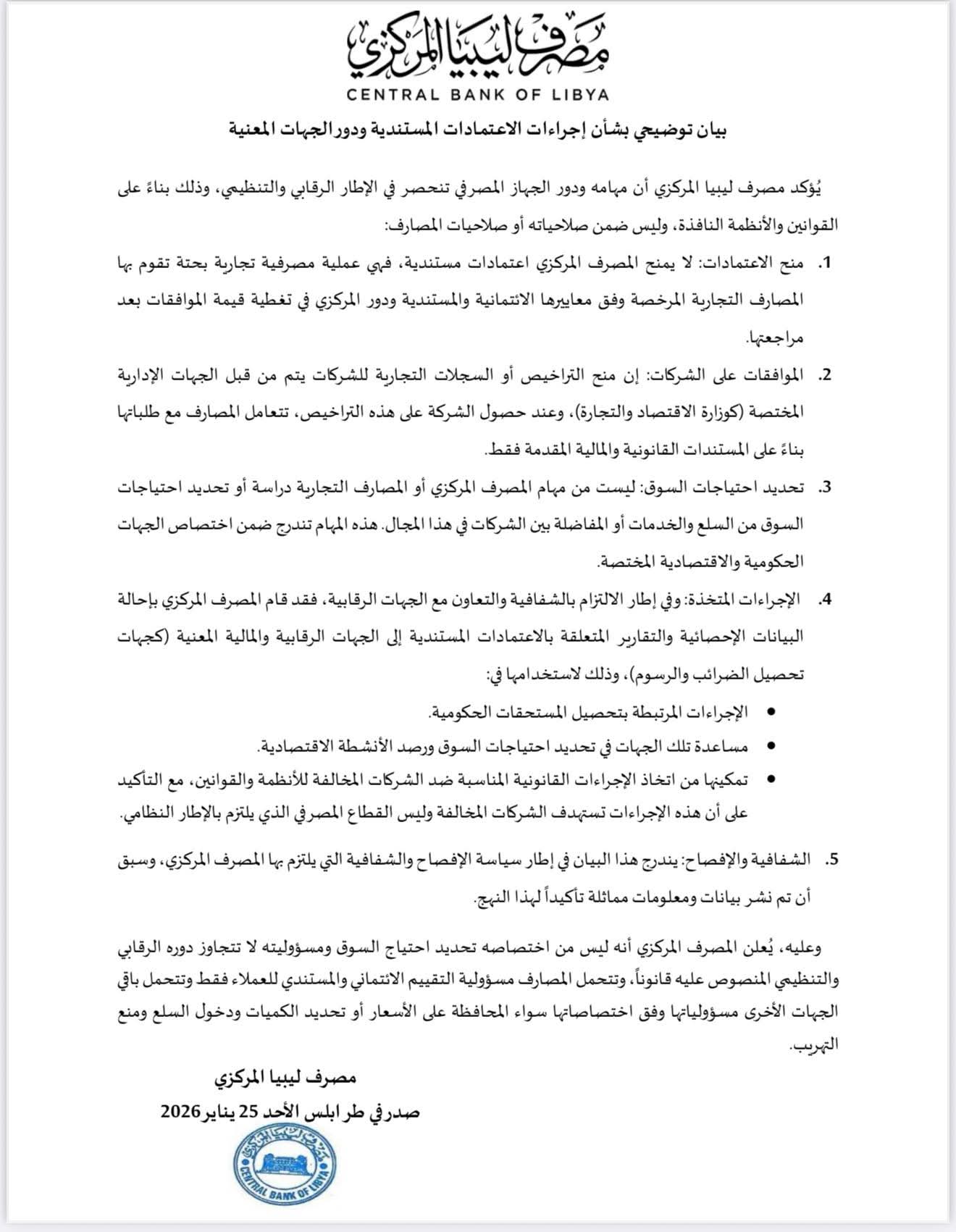 وأضاف المصرف أن البيان يندرج ضمن سياسة الإفصاح والشفافية التي يلتزم بها، وأنه سبق نشر بيانات ومعلومات مماثلة تأكيدًا لهذا النهج. وأعلن المصرف المركزي أنه ليس من اختصاصه تحديد احتياج السوق، وأن مسؤوليته لا تتجاوز دوره الرقابي والتنظيمي المنصوص عليه قانونًا، محمّلًا المصارف مسؤولية التقييم الائتماني والمستندي للعملاء فقط، ومحمّلًا الجهات الأخرى مسؤولياتها وفق اختصاصاتها، سواء ما يتعلق بالمحافظة على الأسعار أو تحديد الكميات ودخول السلع ومنع التهريب.