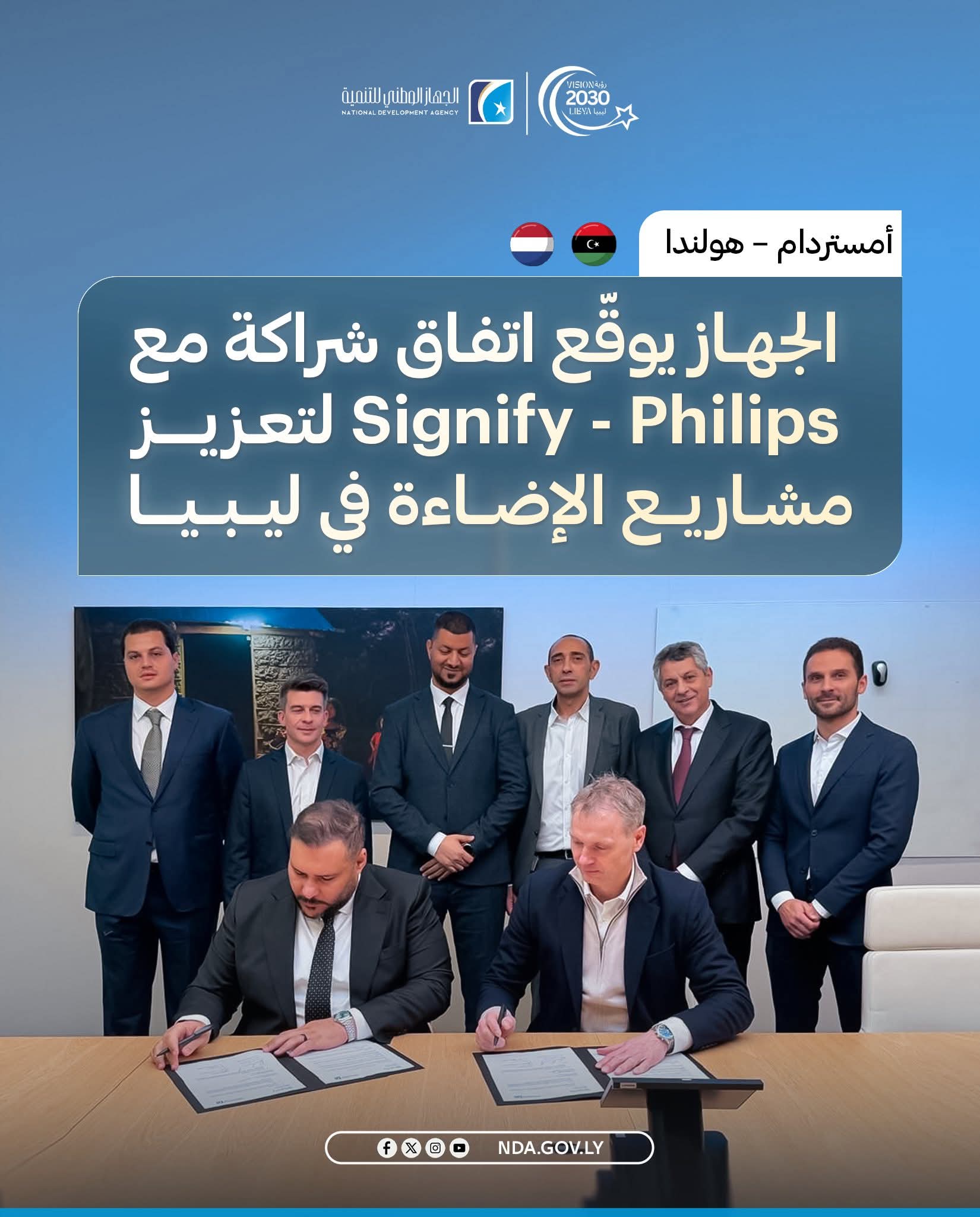 ليبيا – وقّع الجهاز الوطني للتنمية في مدينة أمستردام بهولندا اتفاق شراكة مع شركة Signify Philips، في إطار تعزيز التعاون الدولي ودعم مشاريع التنمية المستدامة في ليبيا.