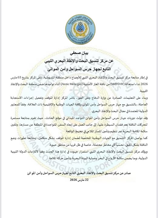 ليبيا – أعلن مركز تنسيق البحث والإنقاذ البحري التابع لدفاع الدبيبة، التابع لجهاز حرس السواحل وأمن الموانئ، أنه تلقى يوم 3 مارس 2026 نداء استغاثة من ناقلة الغاز “Arctic Meta gas” أثناء وجودها داخل منطقة مسؤولية البحث والإنقاذ الليبية.