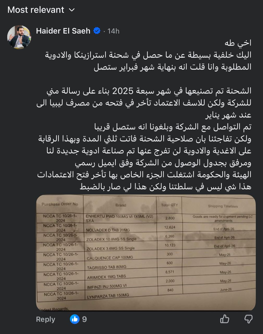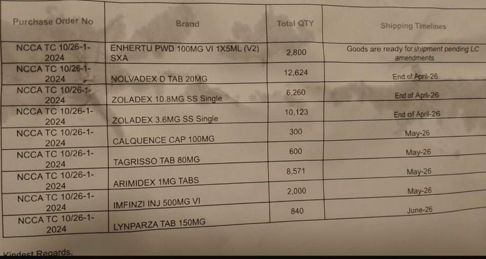 وتضمن الجدول المتداول مواعيد شحن لعدد من أدوية الأورام، من بينها أدوية تحمل أسماء تجارية مثل NOLVADEX وZOLADEX وTAGRISSO وARIMIDEX وIMFINZI وLYNPARZA، مع مواعيد وصول تمتد بين نهاية أبريل ومايو ويونيو 2026، فيما أشير بشأن أحد الأصناف إلى أن البضاعة جاهزة للشحن بانتظار تعديل الاعتماد المستندي.
